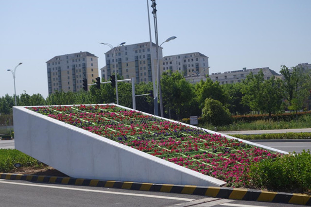 精神堡壘斜面長約8.5米,寬約3.2米,本次栽植的鮮花主要利用大紅色、粉紅色矮牽牛與紫色矮牽牛相互搭配,形成一幅美麗的圖案,再次為園區(qū)入口形象增添光彩。