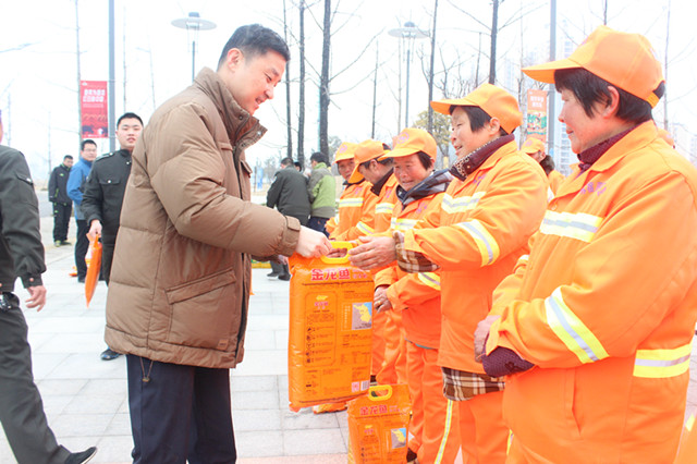 在慰問現(xiàn)場,許紹杰與城市維護工人親切握手,詢問他們工作、生活情況,并送上了米、油、面等慰問品,感謝他們一直以來為蘇宿園區(qū)城市維護工作付出的辛勤勞動,并衷心祝愿他們春節(jié)快樂、身體健康。